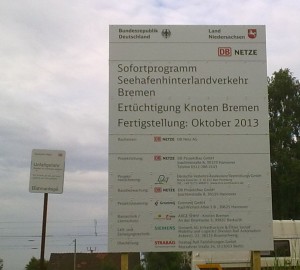 Dito beim Thema Bahnausbau beim Verkehrsressort. Beim Kletterbunker Halmerweg steht ein Schild “Sofortprogramm Seehafenhinterlandverkehr Bremen — Ertüchtigung Knoten Bremen — Fertigstellung Oktober 2013”.